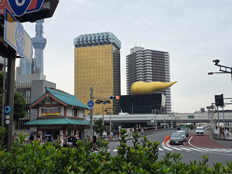 일단 상점가 아케이드로 연결되는 1번 출구로 나오자. 그리고선 바로 뒤돌아서 도로를 따라 가면 강변과 함께 황금빛 응가 모양의 조형이 달린 건물이 저 멀리 보인다. 사실 이건 응가가 아니라 맥주를 형상화한 것이라고 한다. 여기가 아사히 맥주 본사 건물이거든.