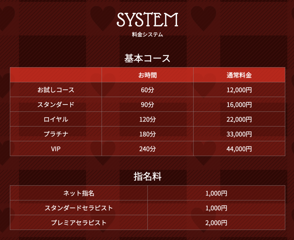 가격은 60분에 12,000엔. 흐음… 생각보다 저렴하다. 물론 이 가격은 시험삼아 한번 해본다는 뜻의 <오다메시코스>다. 스탠다드는 90분에 16,000엔. 두시간을 받으면 22,000엔. 아가씨를 지명하면 1000엔이 추가되고 더 이쁘고 괜찮은 아가씨를 지명하면 2,000엔이 추가되는 시스템인데 그 외에 다른 옵션요금 같은 설명은 없다. 그렇다면 마사지에 더해서 추가되는 므흣함이 이 요금 안에 다 포함되어 있다는 얘기인가? 그렇게 보기에는 요금 자체가 너무 싼데….