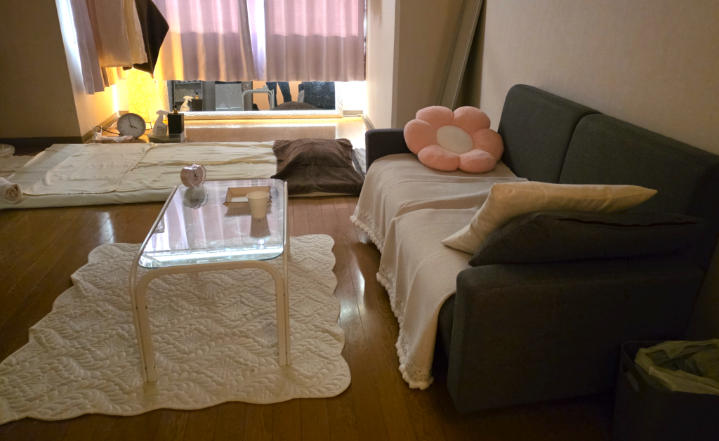 실내는 딱 이런 분위기다. 깔끔하고 아늑하고 좋다. 호테헤루같은 경우엔 호텔대실비가 따로 드는게 부담인데 여기는 이렇게 업장이 마련되어 있으니 추가비용 걱정은 안해도 되어서 좋다. 일반 원룸 아파트이기 때문에 그냥 여자친구 집에 놀러온 것처럼 샤워실에 가서 샤워하고 서비스를 받으면 된다.