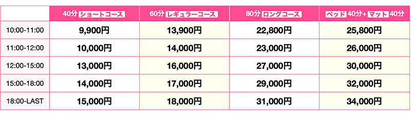 40분 숏코스를 선택한다고 하면 최저가 요금이 9,900엔 밖에 하지 않는다. 40분은 좀 아쉽다. 그러면 60분 레귤러 코스로, 그래도 가격은 13,900엔이다. 매트에서 40분 서비스 받고 침대 위로 이동해서 40분 동안 더 서비스를 받는 풀코스를 선택해도 최저가가 25,800엔이다. 물론 오후나 저녁 시간대로 갈 수록 요금이 비싸지는 시간대 차등 요금제이긴 하지만 마음 먹고 일찍 가기만 하면 가장 저렴한 요금으로 즐길 수 있는 것이다. 그리고 데리헤루나 호테헤루는 서비스요금 외에도 모텔비를 따로 내야 하기 때문에 숨겨진 요금이 발생하게 된다. 하지만 매트데YJO는 자체 업장이 있기 때문에 그런 별도의 요금이 없다는 것도 대단히 매력적인 부분이다.